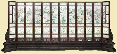该十二扇精美屏风的每一扇面均精雕细刻,并在大面积黄花梨分层框架台面中镶嵌了共64块精致粉彩砂瓷,超凡出众。所有粉彩砂瓷上都绘有道教神话传说中的神仙人物形象,其上配有吉祥花鸟图案并题注了双关语和字谜等文字,充分展示了每幅画面意欲表现的象征意义。众所周知,黄花梨材质是最奢华的亚热带密实纹理硬木木材之一,从明代开始应用于古典家具制作,以清晰的淡黄色纹理最受世人追捧。