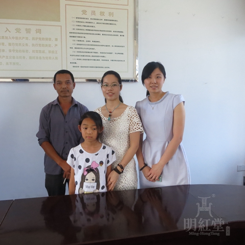 在村支部会议室里大家和孩子们及家长围坐一团,交流着孩子们的学习和生活情况,并在一团和气的氛围中感受着爱的力量。尔后明红堂红木总经理余小凤与被资助的李宇珍小朋友合影留恋希望其能努力学习,快乐生活。
